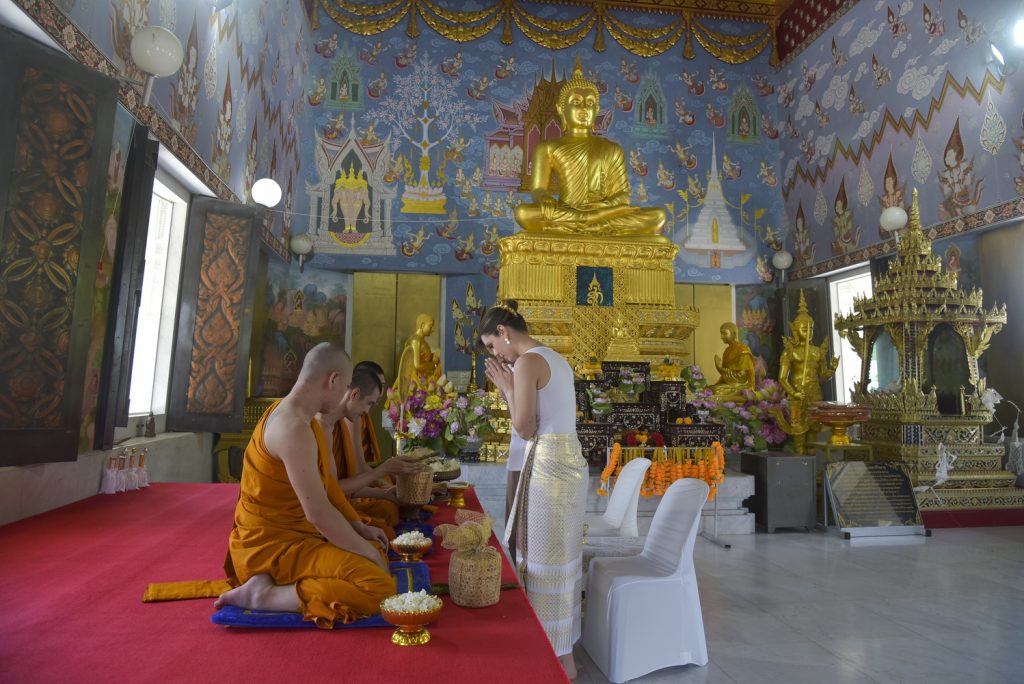 Die Zeremonie beginnt mit einer respektvollen Verbeugung beim Betreten des Tempelgeländes. Umgeben vom sanften Licht der Kerzen und dem Duft von Räucherstäbchen nimmt das Paar vor den Mönchen Platz und überreicht eine zweite Gabe als symbolischer Beginn der Segnung.